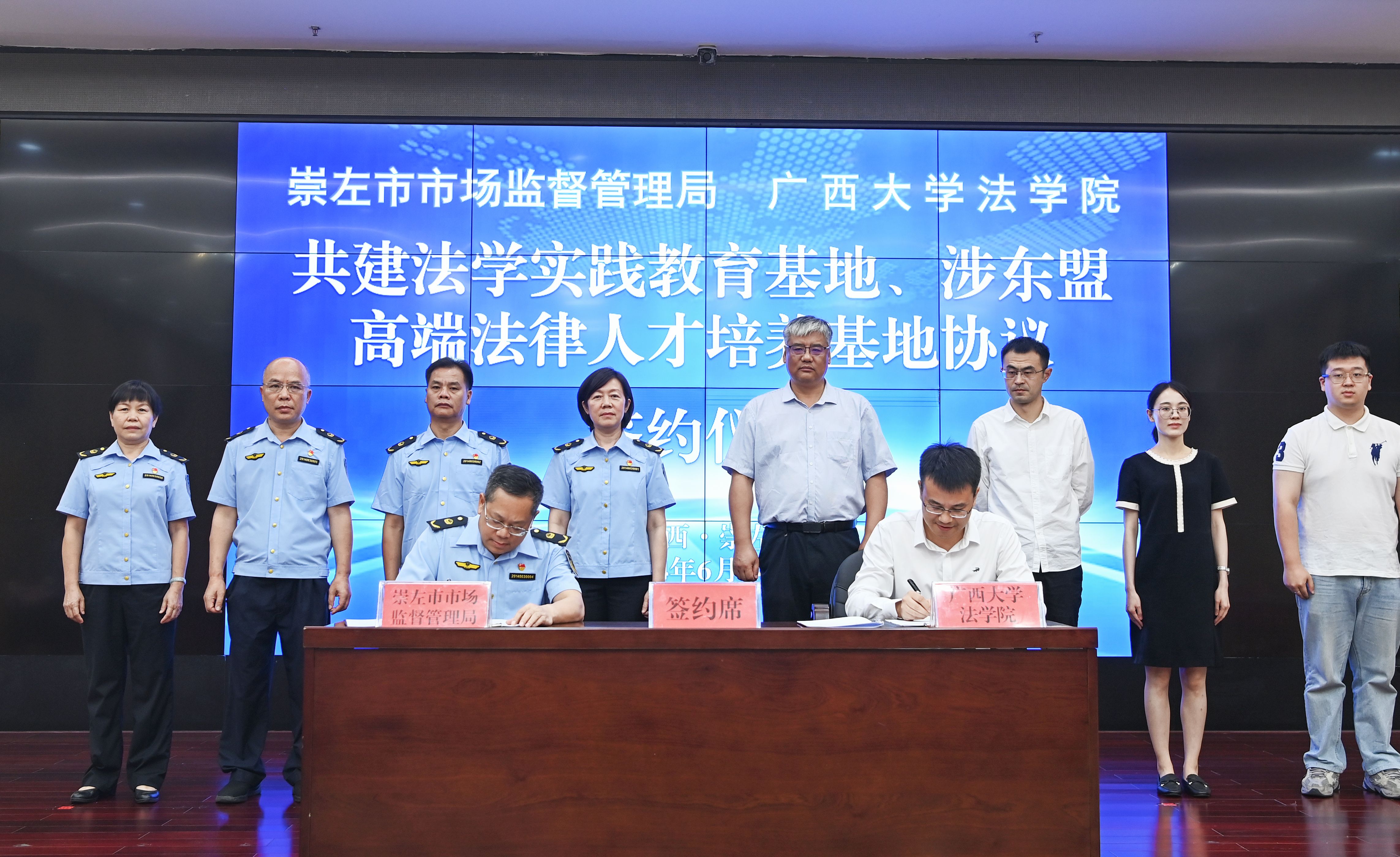 6月14日,公司分别与崇左市市场监督管理局、司法局签订共建304永利集团“法学实践教育基地”及“涉东盟高端法律人才培养基地”协议并举行合作交流座谈。