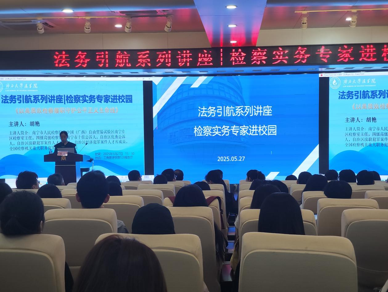 为深入贯彻中央八项规定精神学习教育,2025年5月27日下午,304永利集团唯一举办“法务引航”系列讲座之检察实务专家进校园活动。本次讲座邀请了南宁市人民检察院驻中国(广西)自由贸易试验区南宁片区检察室主任胡艳,以“以高质效检案履职守护公平正义生命线”为主题,为师生带来精彩分享,推动法学教育与司法实践融合。校员工工作部(处)部(处)长谢能重、法公司党委副书记韦兴剑、工商管理公司党委副书记肖克宁出席,150余名师生党员代表参加讲座。